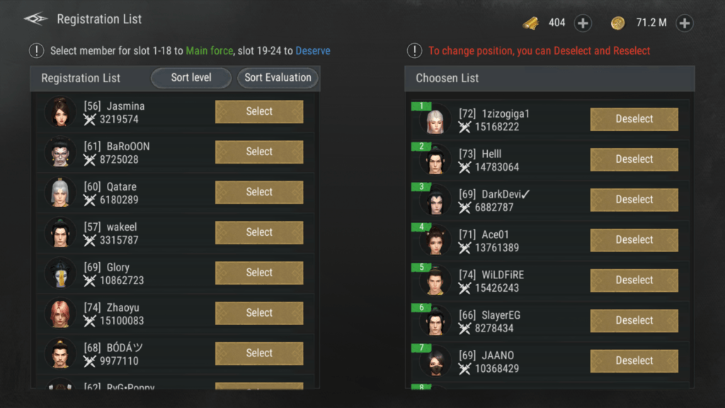 • خلال وقت التحضير، يقوم قائد النقابة باختيار 6 أعضاء من بين الـ 24 عضوًا المسجلين للمشاركة في المعركة.