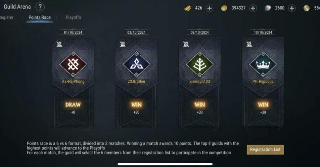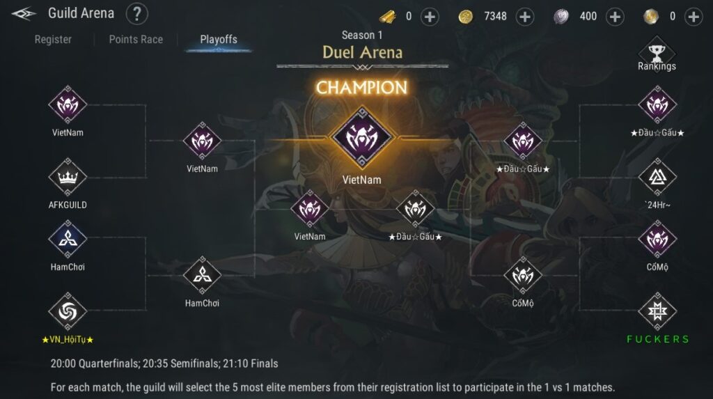 • من الجدير بالذكر أنه في جولة التصفيات، يمكن لجميع اللاعبين مشاهدة مباريات النقابات الأخرى عبر واجهة التصفيات.