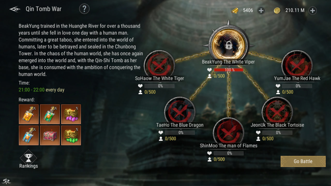 • تجري معارك الزعماء التمهيديين الخمسة (Preliminary Bosses) في خريطة Qin Tomb Floor 5، بينما يقام قتال الزعيم النهائي (Final Boss) في خريطة Qin Tomb Floor 6.