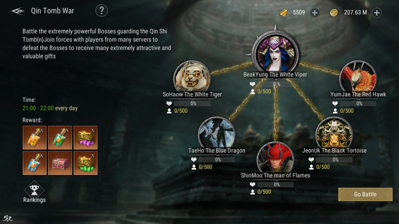 📌 في الأدوار العليا من كهف جانجان (Qin Shi Huang’s Tomb)، يظهر زعماء أقوى وأكثر تحدياً، حيث يحتاج اللاعبون إلى قوة جماعية وتكتيك منظم للتغلب عليهم والحصول على المكافآت الأعلى قيمة.